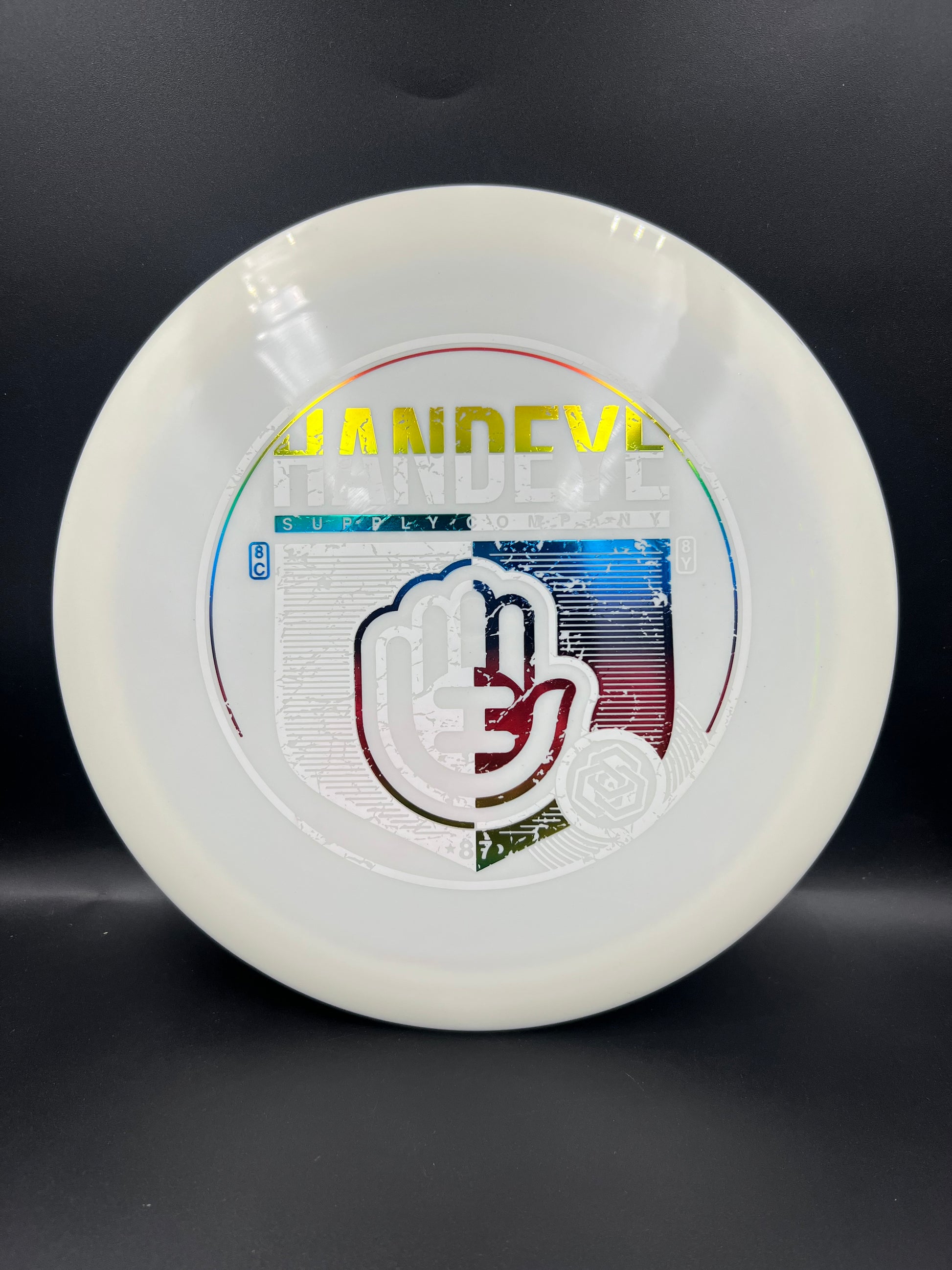 Dynamic Discs Fuzion Getaway is an overstable fairway driver. With very little turn and a good fade, this will be a predictable control disc. You can use this if you like the Escape but want it to be just a bit more beefy. This one has the Handeye Suppy art stamped on it.