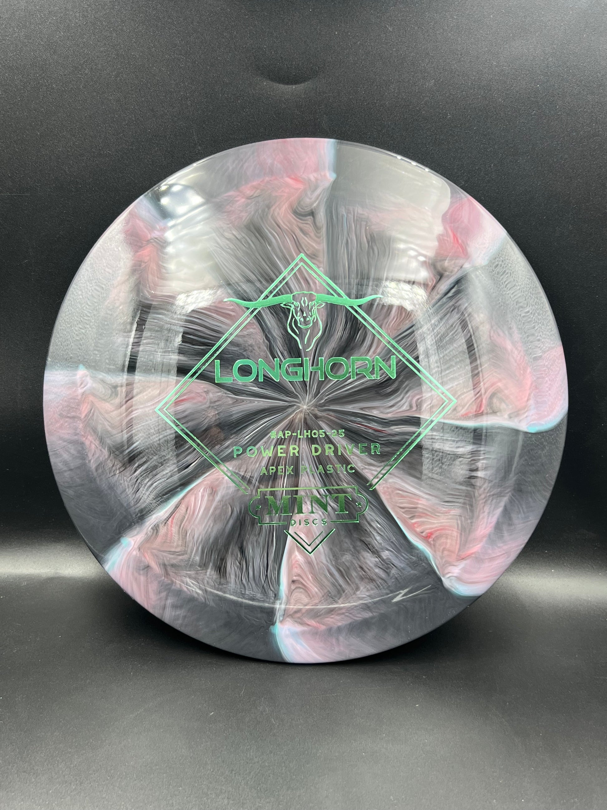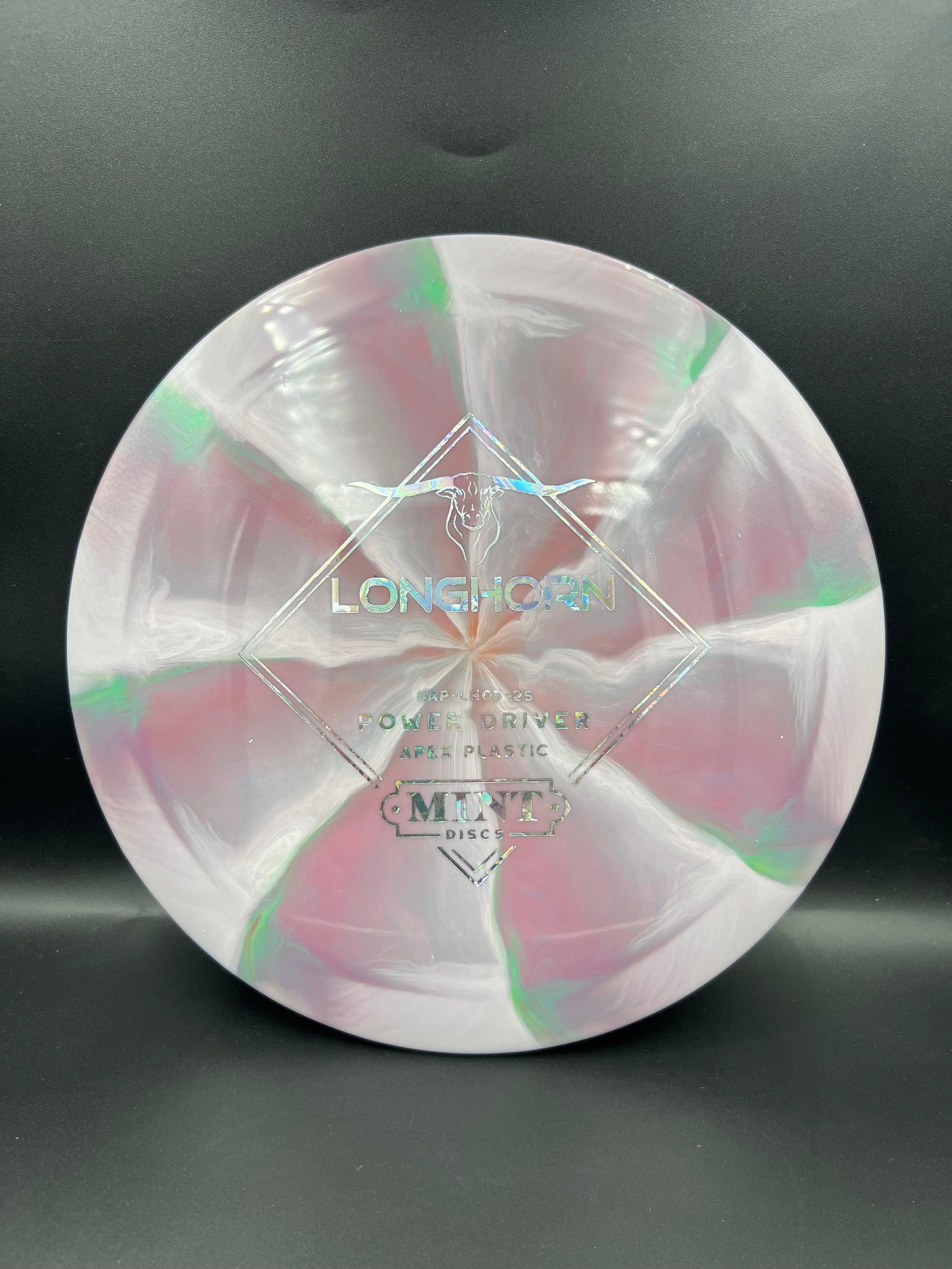 Mint Apex Swirl Longhorn is an overstable distance driver. It should have a little turn at high speeds for bigger arms with a strong fade on the end. It also has a lower glide helping to make this a predictable driver and a good choice for cutting through the wind.