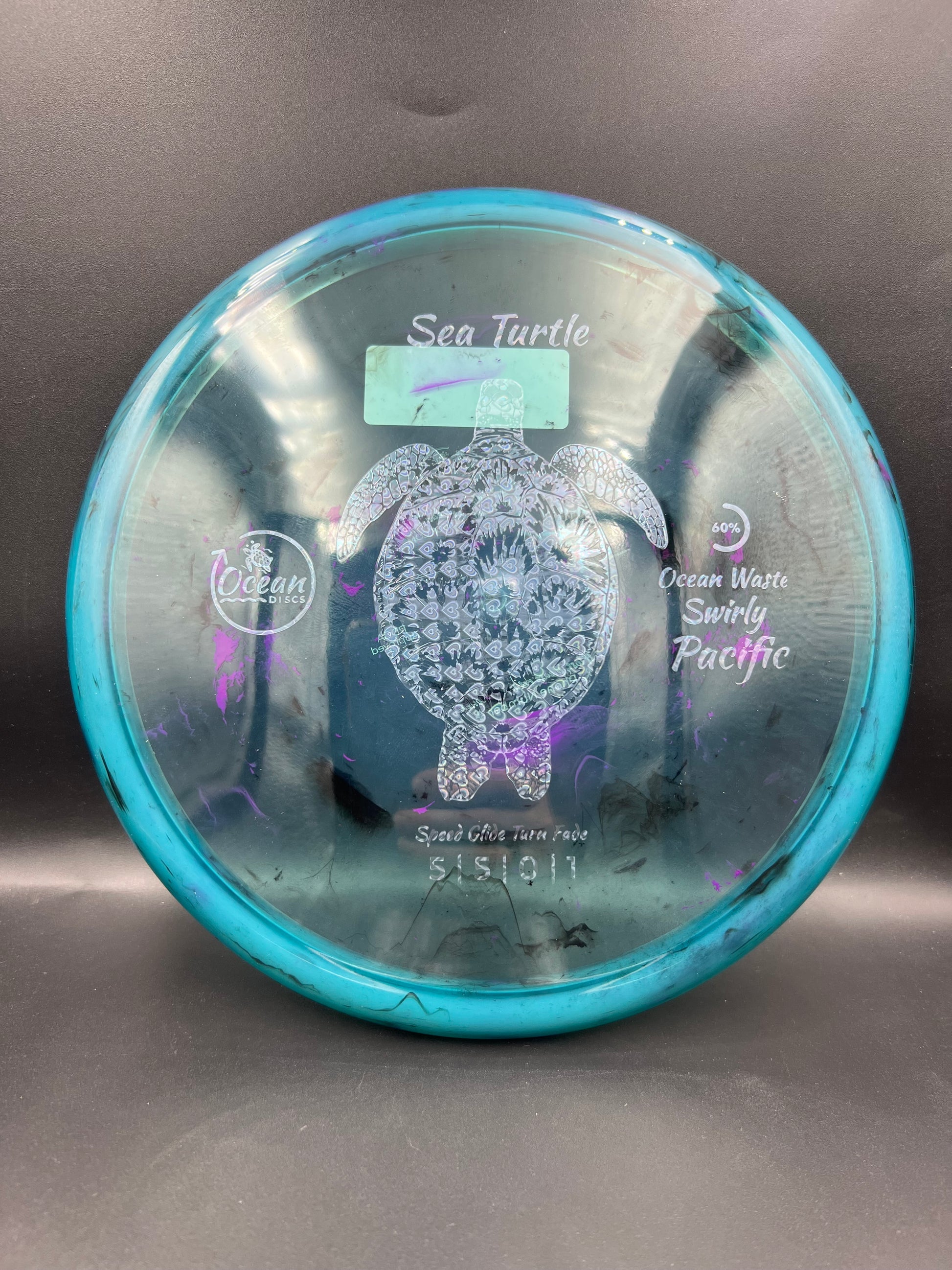 Ocean Discs Swirly Pacific Sea Turtle is a straight flying midrange with just enough fade on the end to keep it on line and help it not turn over. It has a nice glide on it to help is stay straight and stay up a little longer. This disc is made from 60% recycled ocean waste, thinks like fishing nets and bottles.